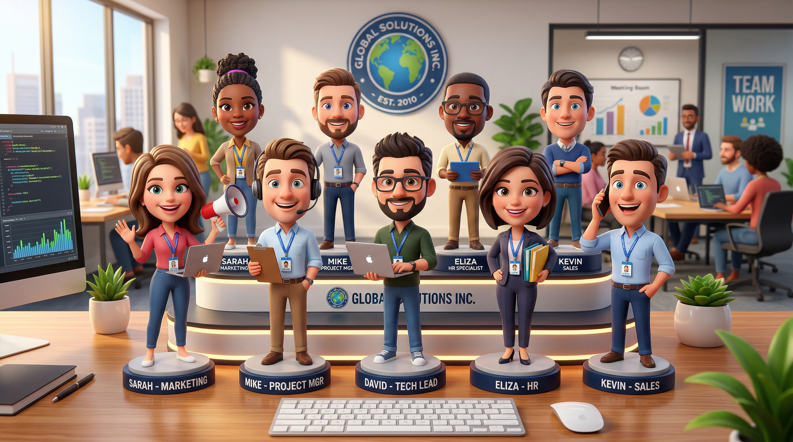 Every bobblehead wears a custom outfit with your company logo. Your brand sits on their desk for years — the ultimate conversation starter.